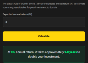 Quickly estimate how many years it takes for your investment to double at any annual return rate. The timeless shortcut for compound growth — perfect for fast mental math and long-term planning.